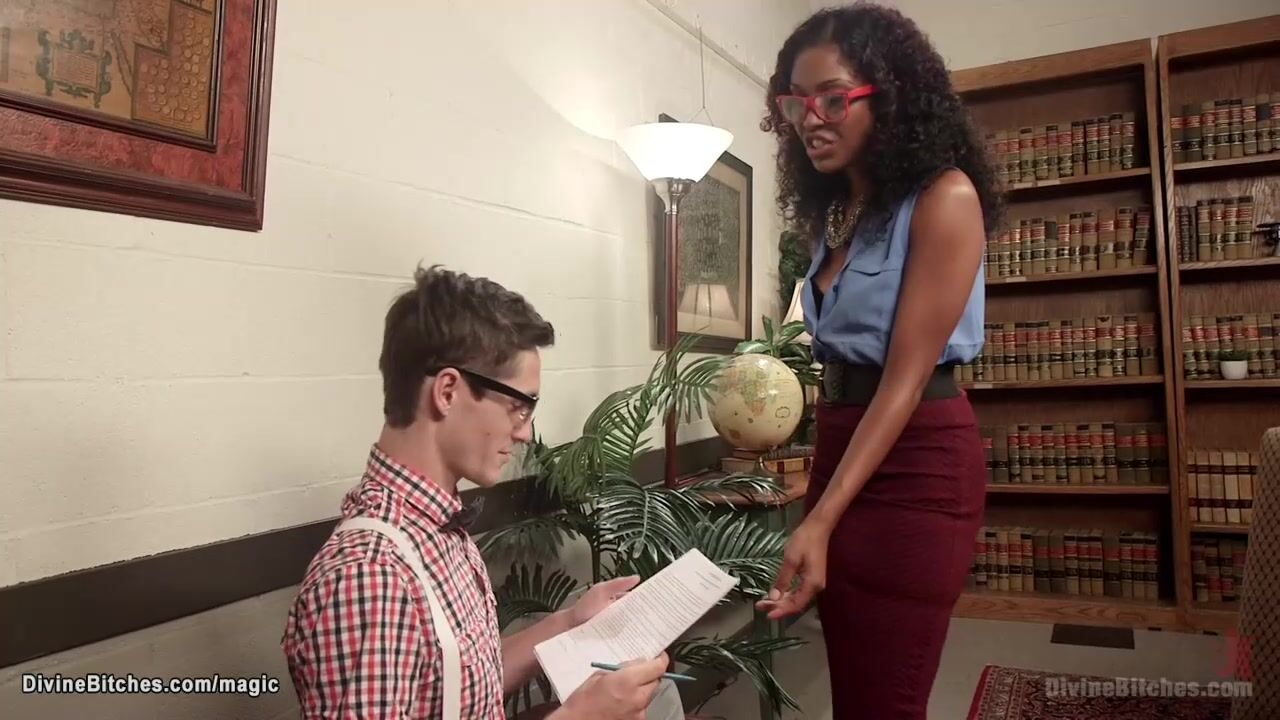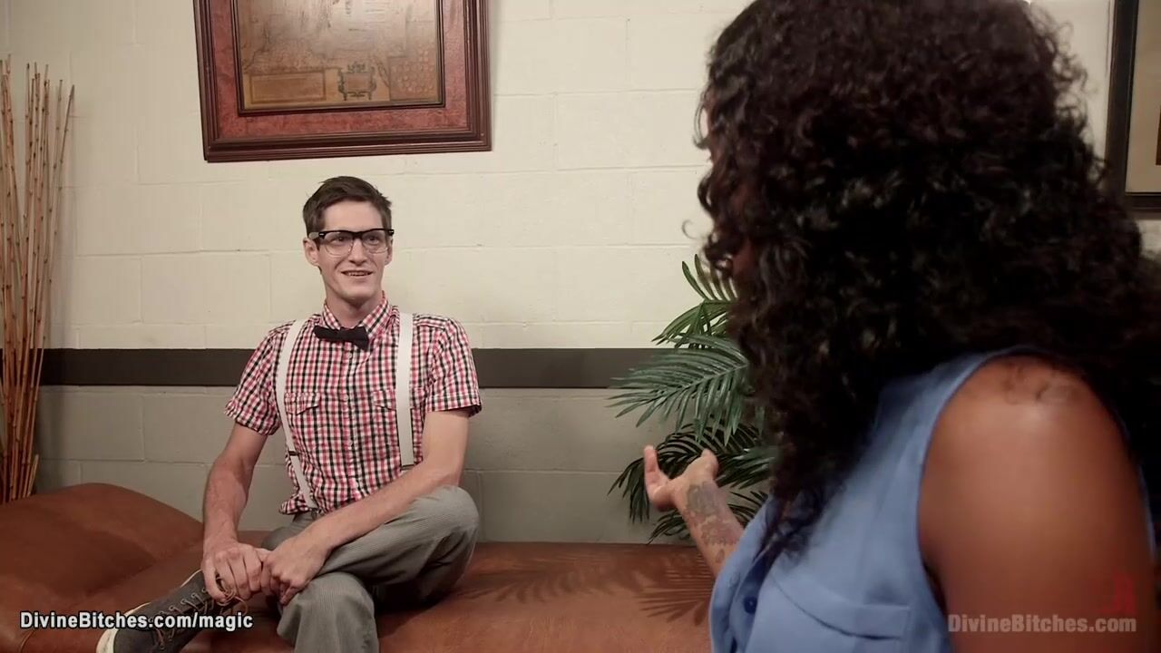 Sexy ebony therapist Lotus Lain otk spanks patient Tony Orlando then cuckold him and makes suck big cock to Rob Yaeger then fucks above his face in dungeon