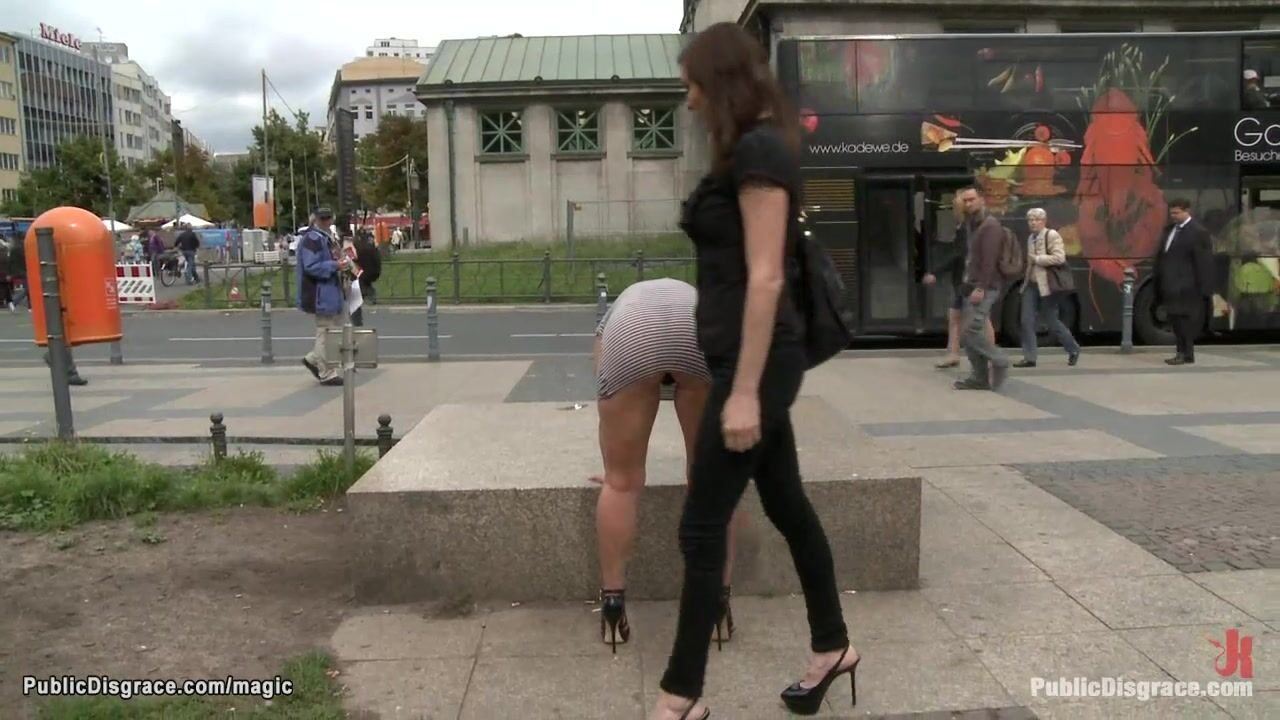 German blonde babe Uma Masome in tight mini dress gets big ass spanked in public by domme Princess Donna Dolore then gets head boxed and mouth fucked till gang banged by big dicks