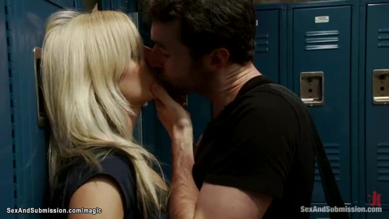 Boyfriend James Deen binds big tits slim blonde girlfriend Haley Cummings and with big cock pal Mr Pete gang bangs her in locker room