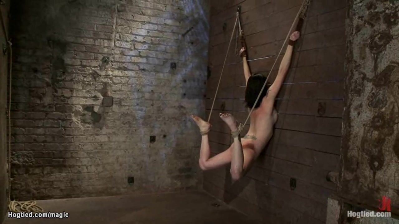 Brunette slave Scarlet Faux is bound faced to the wooden wall gets back zippered then legs pulled in the air in back arch position by two masters on hogtied