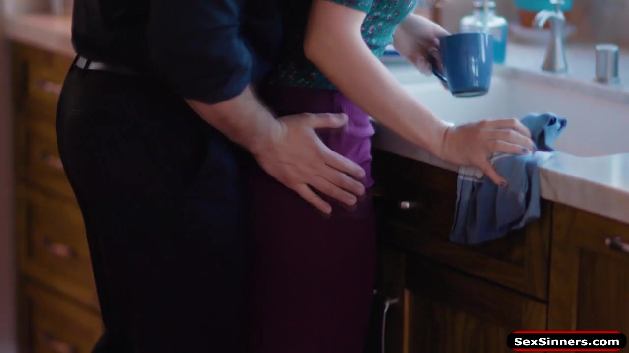 Guy can fuck his petite wife whenever he wants because she cheated.After doing the dishes he takes down her panties and licks her pussy.The small tits brunette is throatfucked by his big cock and rims him.He bangs her hard in her shaved snatch