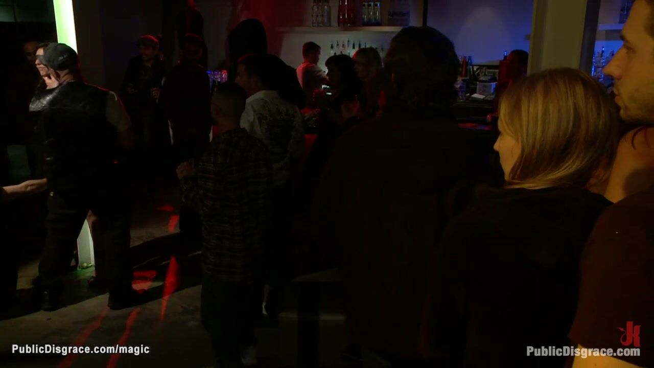 Slim hairy pussy brunette slave Lou Charmelle gets bound and blindfolded then rough fucked by huge dick James Deen in public crowded bar