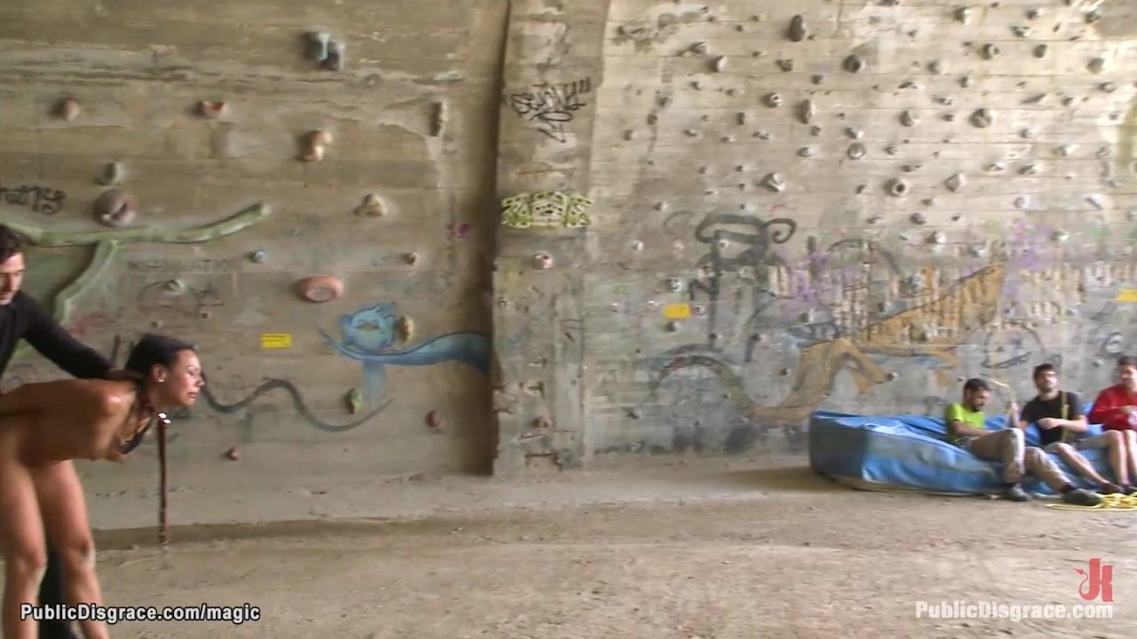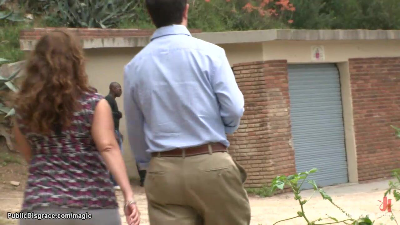 Sexy brunette Latina babe Lara Tinelli on knees with bound hands behind gets deep throat fucked then banged by big cock master Steve Holmes outdoor in public
