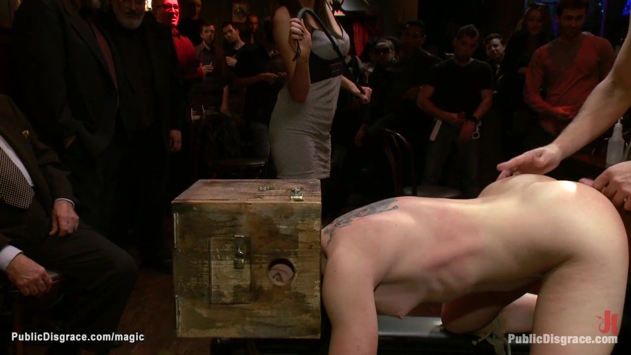Bound brunette slave in doggy position with head trapped in box Cheyenne Jewel gets anal fucked then double penetration banged in public crowded place