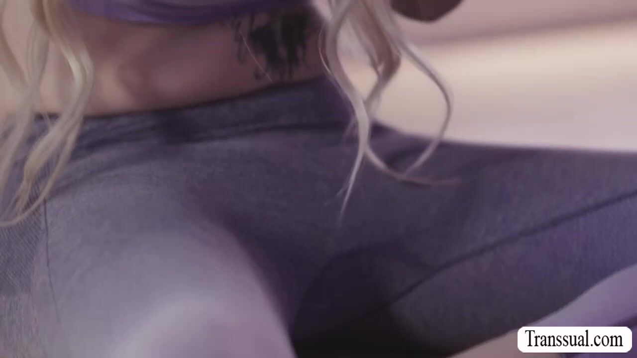 Blonde shemale and her dance partner are on the floor warming up.After that,they get horny and they start kissing each other on the couch.Next is,she lets her horny partner suck her shecock and in return,she licks her pussy first before she fucks it.