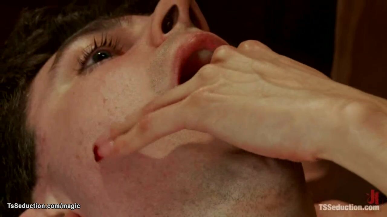 Big tits petite blonde shemale Paris A binds and slaps bartender Chris Ockham then fucks him in mouth and ass on table in empty bar