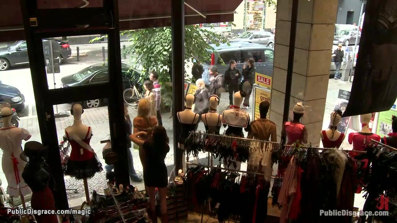 Naked blonde bound in shop window