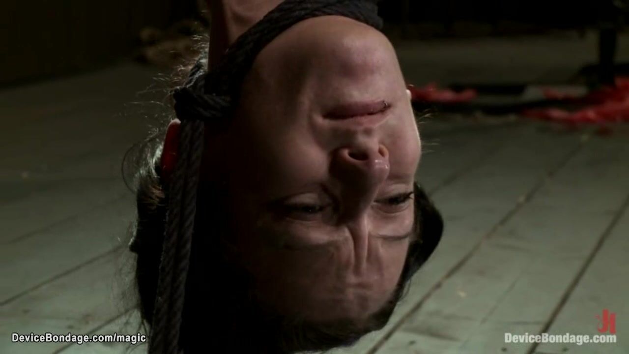 Slim brunette slave Elise Graves is strapped by metal in doggy position between electrical bars and gets anal hooked then suffers inverted suspension from master Orlando on device bondage