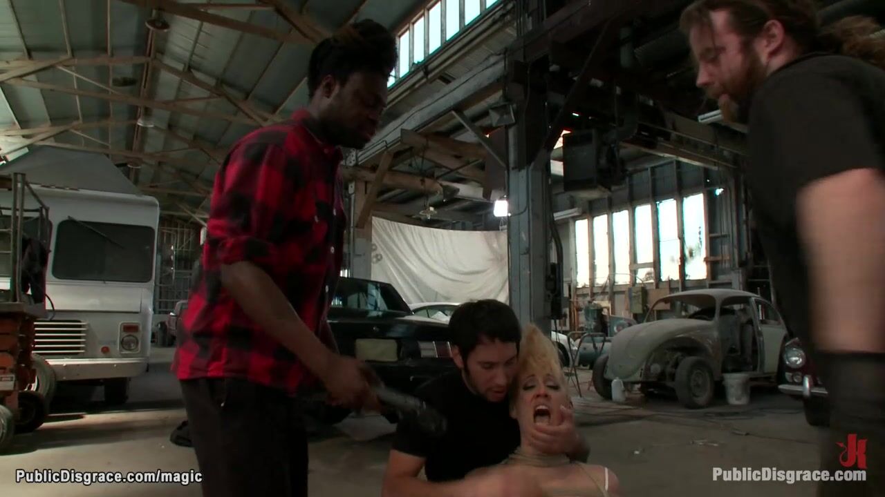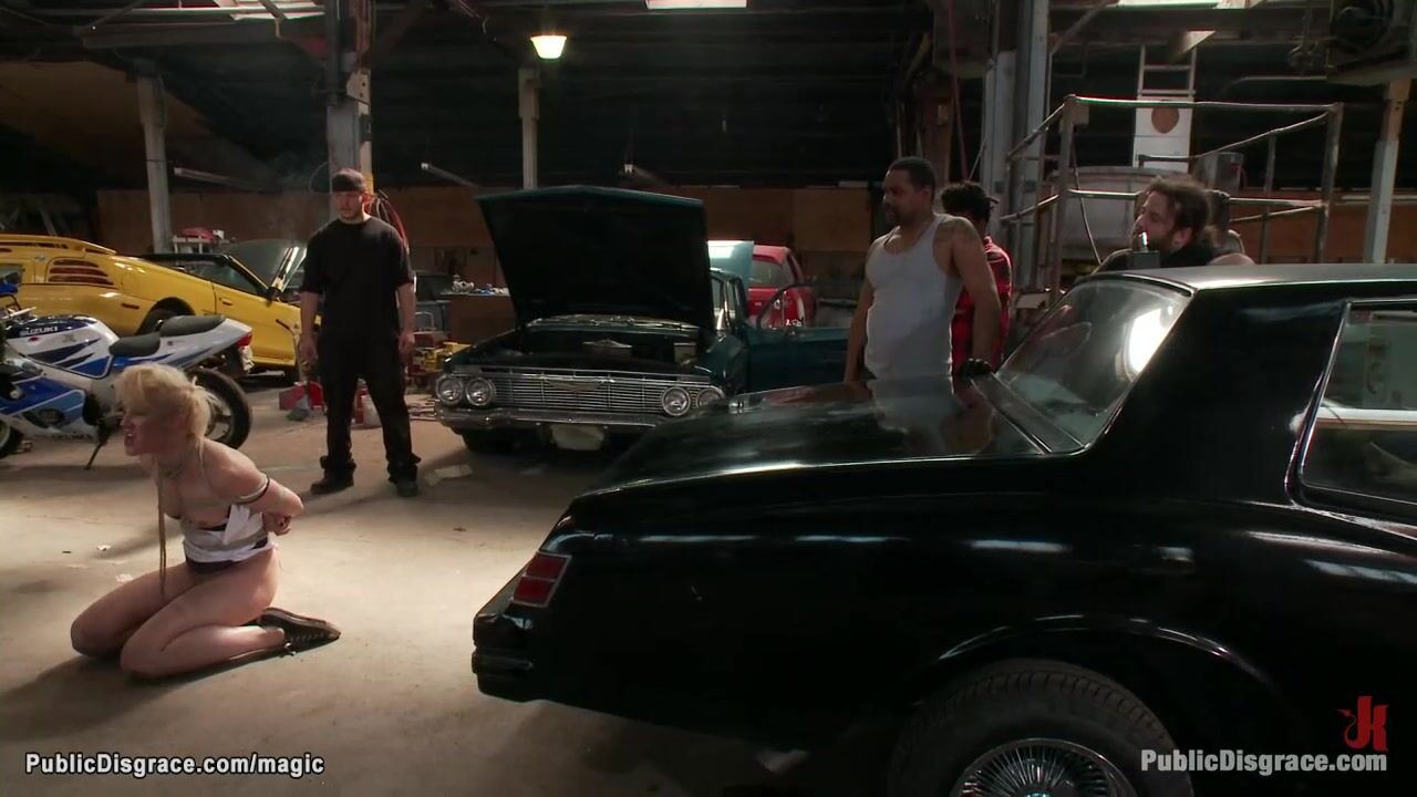 Tommy Pistol brings in public garage hot bound blonde babe Dylan Ryan then with big dick fucks her in mouth and fists her pussy in front of strangers