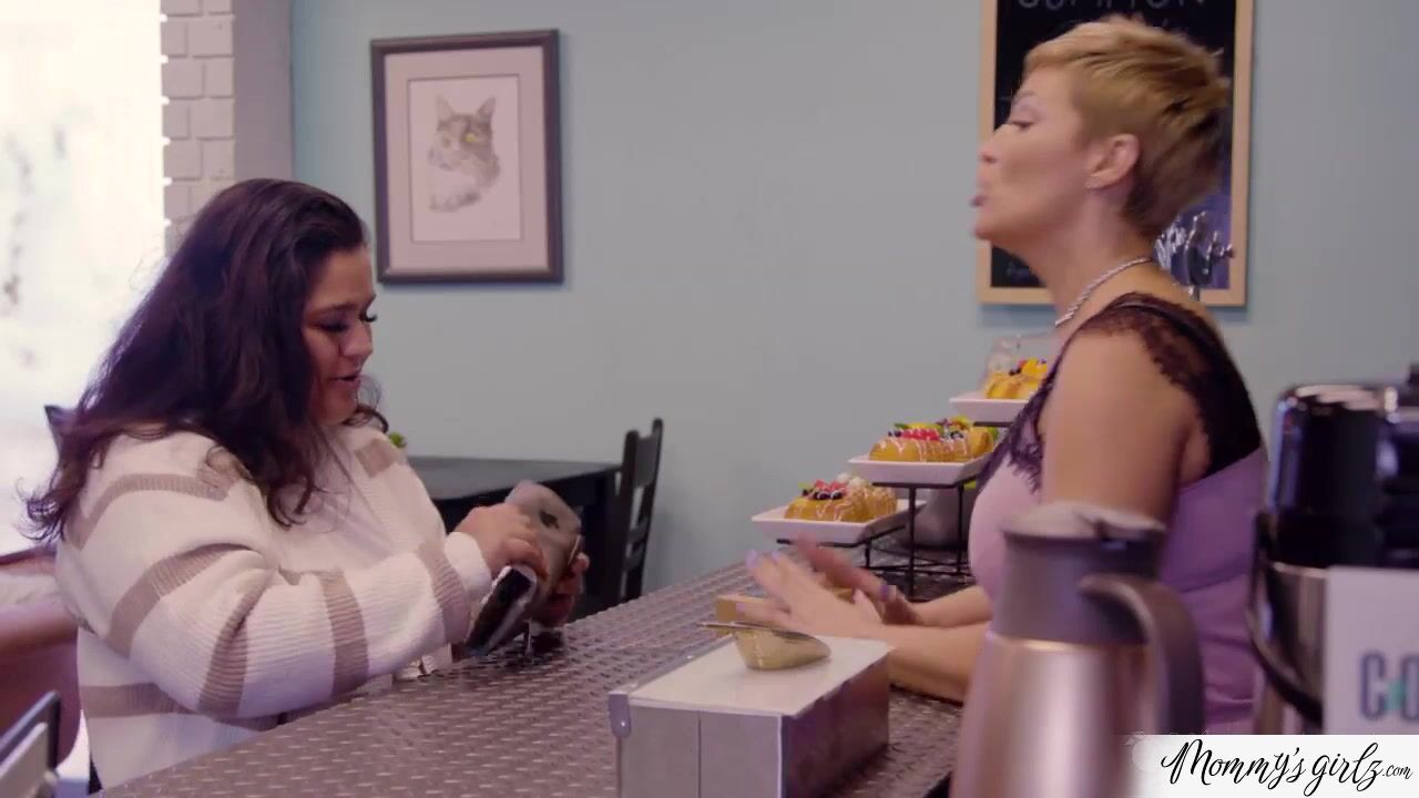 Busty milf stepmom Ryan Keely, a barista,is showing her lesbian stepdaughter, Freya Parker around the cafe.The ladies gets horny and start to kiss and lick.They move to the couch where they continue eating and fingering each others cunt.