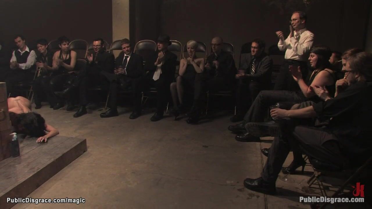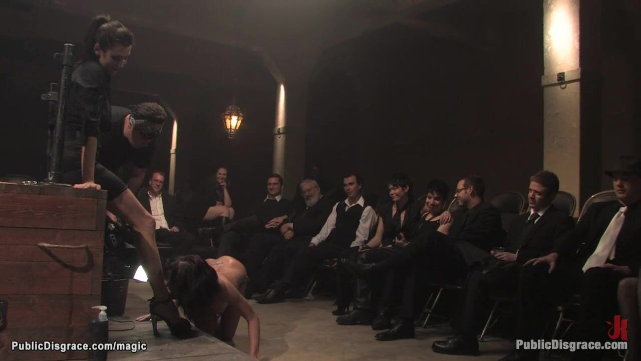 Bound on knees and bent forward with hands in strappado hot brunette French slave Cecilia Vega gets mouth and anal fucked in public by big cock John Strong