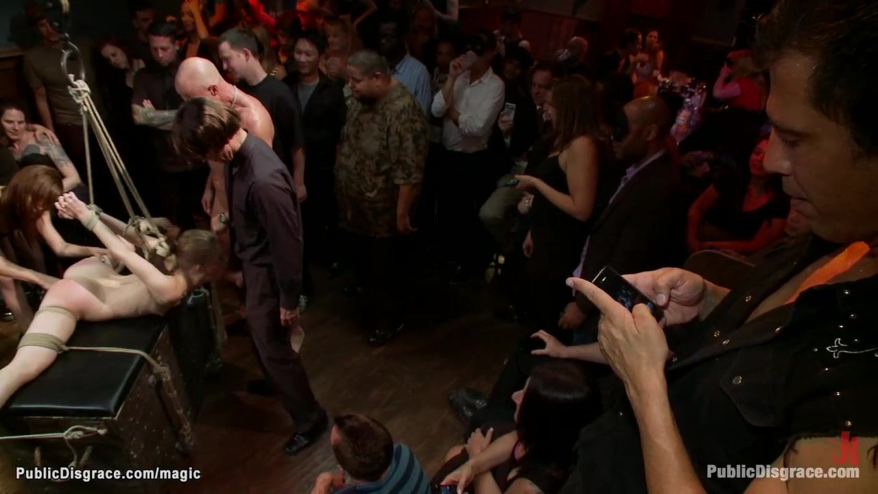 Skinny flexible petite brunette slave Sensi Pearl is bound by Princess Donna Dolore and Mark Davis then vibrated and rough big cock fucked in public bar in front of viewers