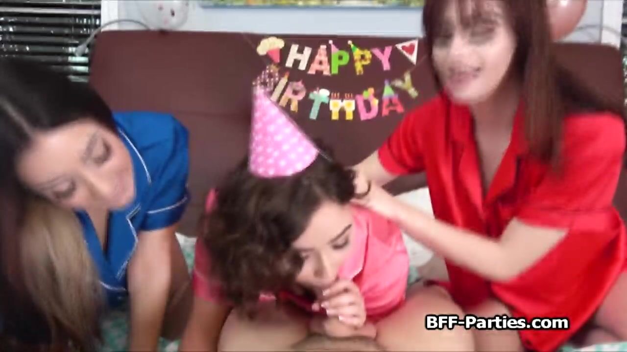Busty beauty Leana enjoys her private bday party with her besties.. but a surprise guest shows up... and he gets to fuck all these lovely babes!