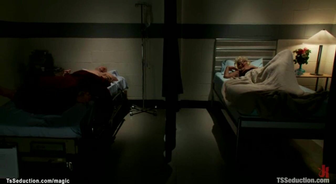 Ebony shemale Mistress Soleli wakes up in the middle of the night very horny and jumps in bed of bound patient Brenn Wyson and fucks him with bbc