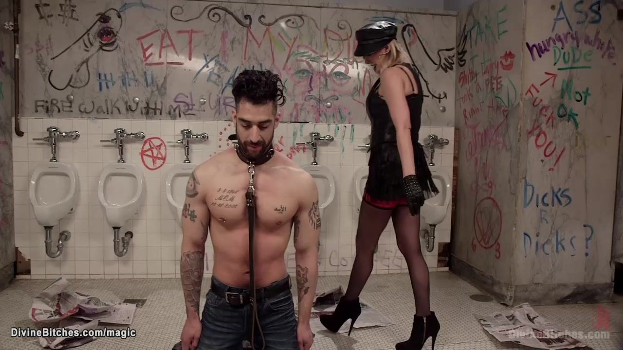 Blonde femdom in kinky outfit Maitresse Madeline Marlowe whipping slave on a leash Samir Hott then puts him in strait jacket and pegs in public toilet