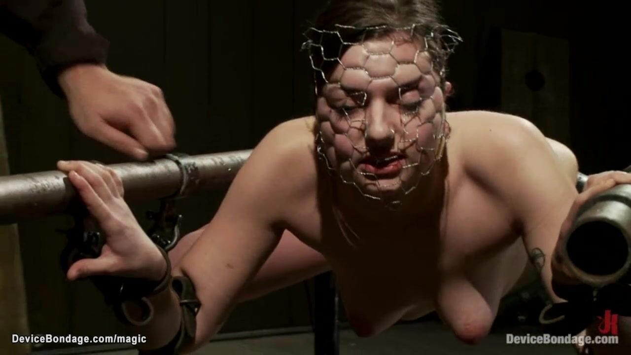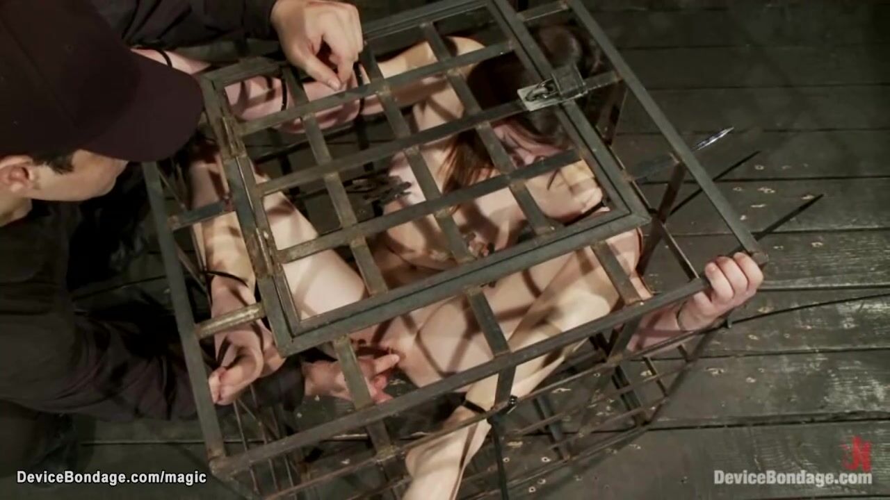 Sexy innocent brunette babe Missy Minks is locked in cage and pussy fingered then in standing position pussy clamped and weighted with small bucket and poured with water