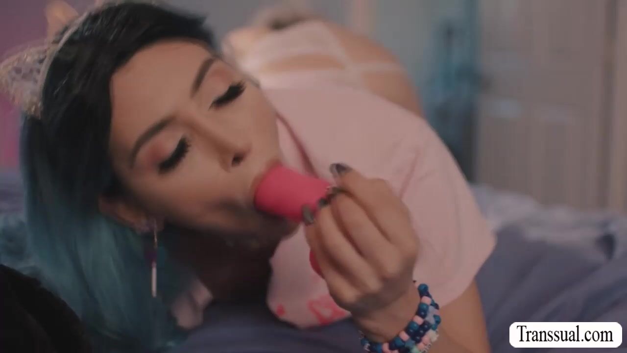 Slutty Tgirl lets her new friend watch while shes toying her tight asshole using dildo.After that,she lets him put his hard dick inside her butthole.Next is,she throats his dick and lets him lick and bareback again her wet asshole.