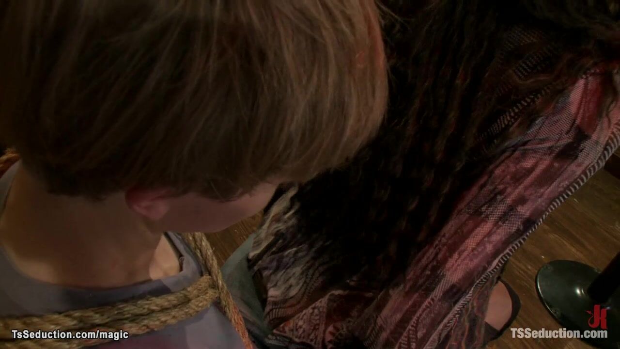 Huge tits brunette Asian shemale bartender Yasmin Lee binds college men Koby Fox and Robert Bridges then sucks them off and anal fucks with big cock