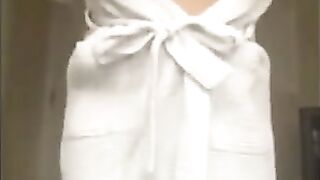 latina in her robe putting on a titty show for our viewing pleasures and she needed was some oil