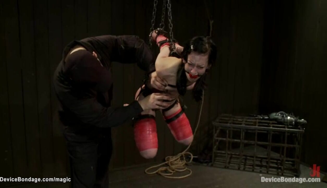 Strapped by metal in doggy position between electrical bars brunette slave Elise Graves gets butt hooked then with hands and legs strapped suspended by chains in the air by master Orlando