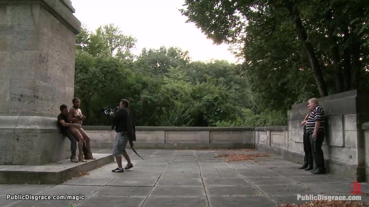 Bound tanned Spanish babe Veronica gets spanked and mouth fucked in bar by Princess Donna Dolore and Tommy Pistol then dragged outdoor and fucked