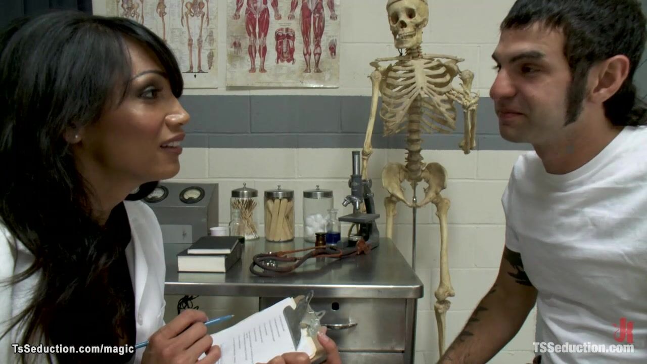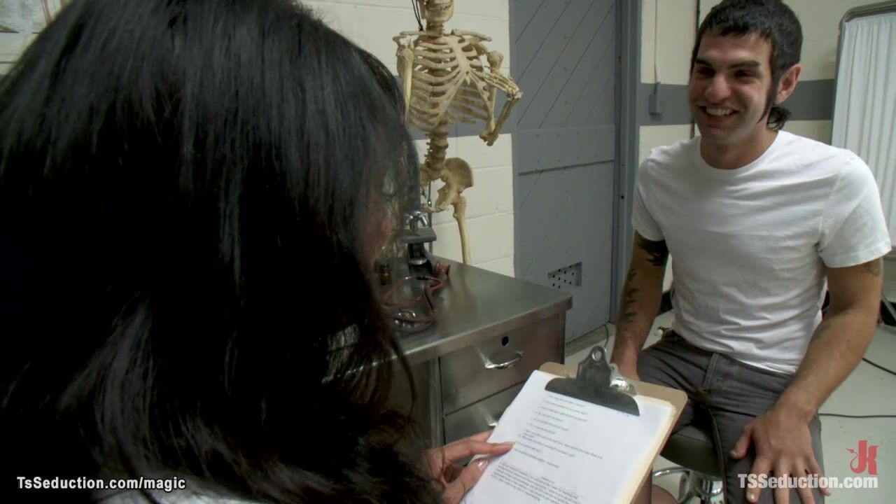 Big boobs brunette Asian shemale doctor Yasmine Lee treats with electric pads strapped patient Reuven then spanks and fucks him in mouth with big cock
