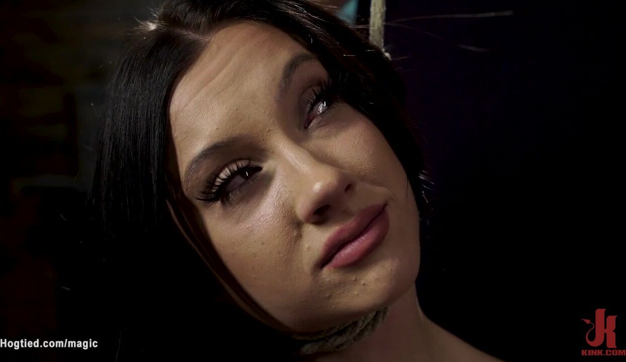 Skinny brunette slave Jazmin Luv gets bound on bench and whipped then in sitting position bowling ball hung for neck till pussy finger fucked on hogtied