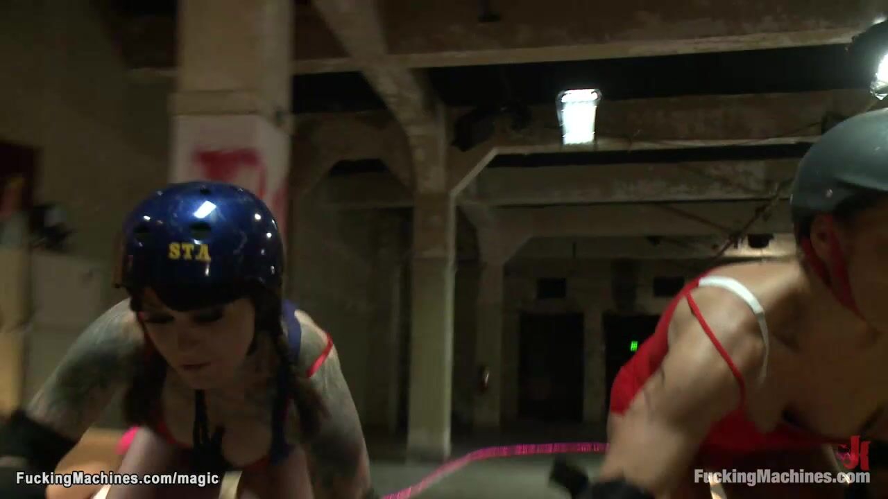 After Roller Derby hot busty brunette MILF Princess Donna Dolore fingers pussy to hot big tits Ariel X and makes her squirting then fucks with machine
