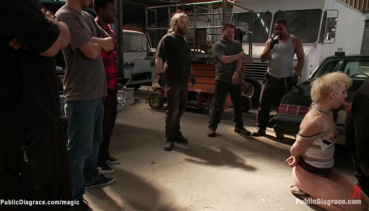 Blonde slave Dylan Ryan with hands bound in box tie gets dragged in auto body shop by master Tommy Pistol then anal fingered and fucked for public