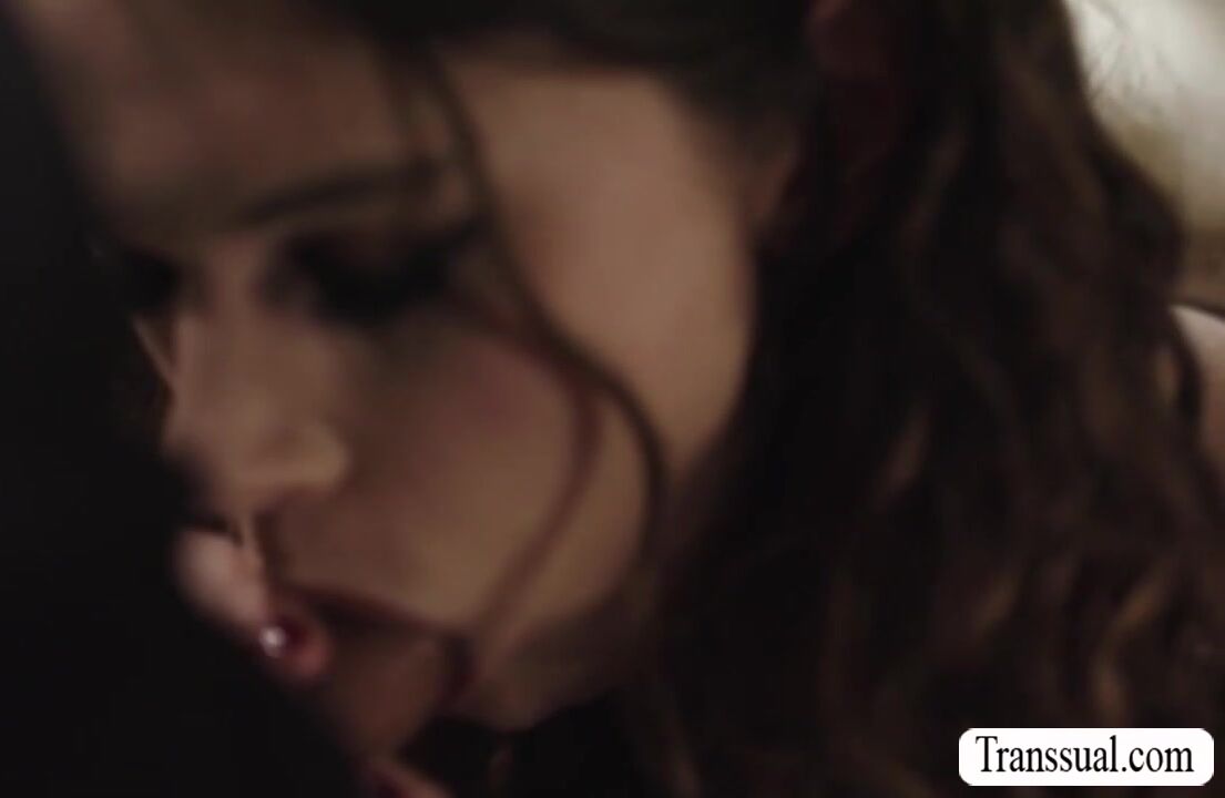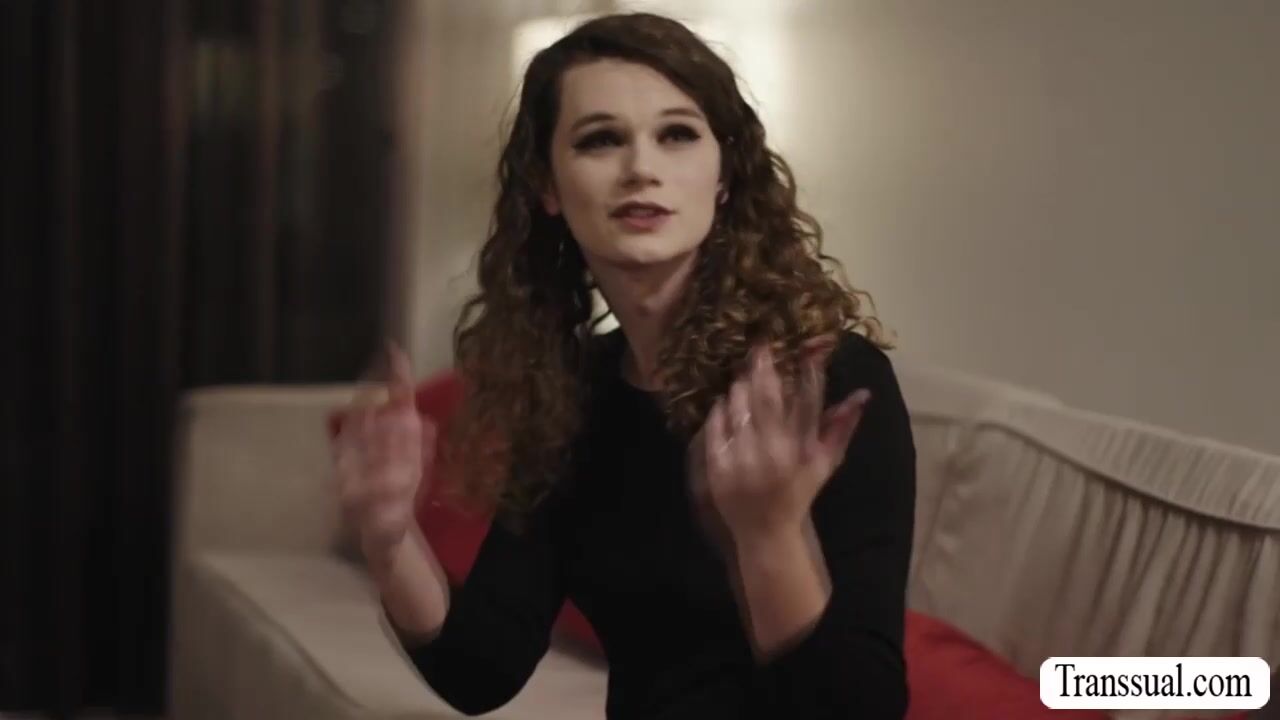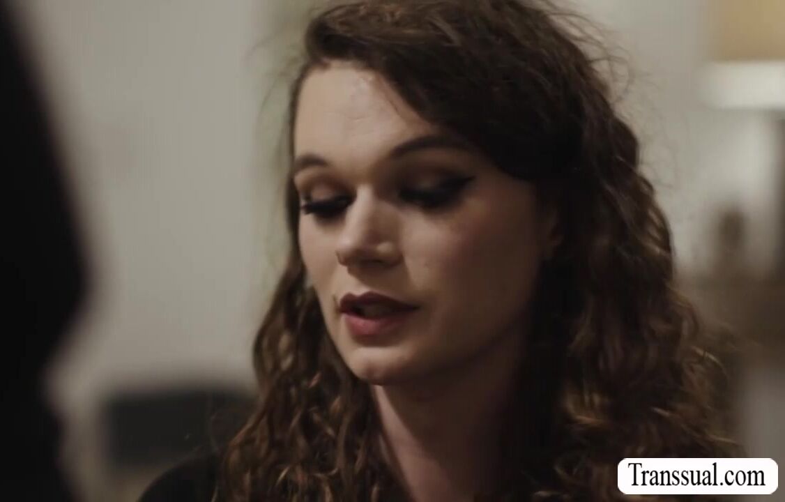 Curly shemale meets her new handsome stepdad.After that,they spend time to know each other.They start kissing each other and she throats her stepdads big cock and in return,her stepdad licks her ass first before he bareback fucks her ass.
