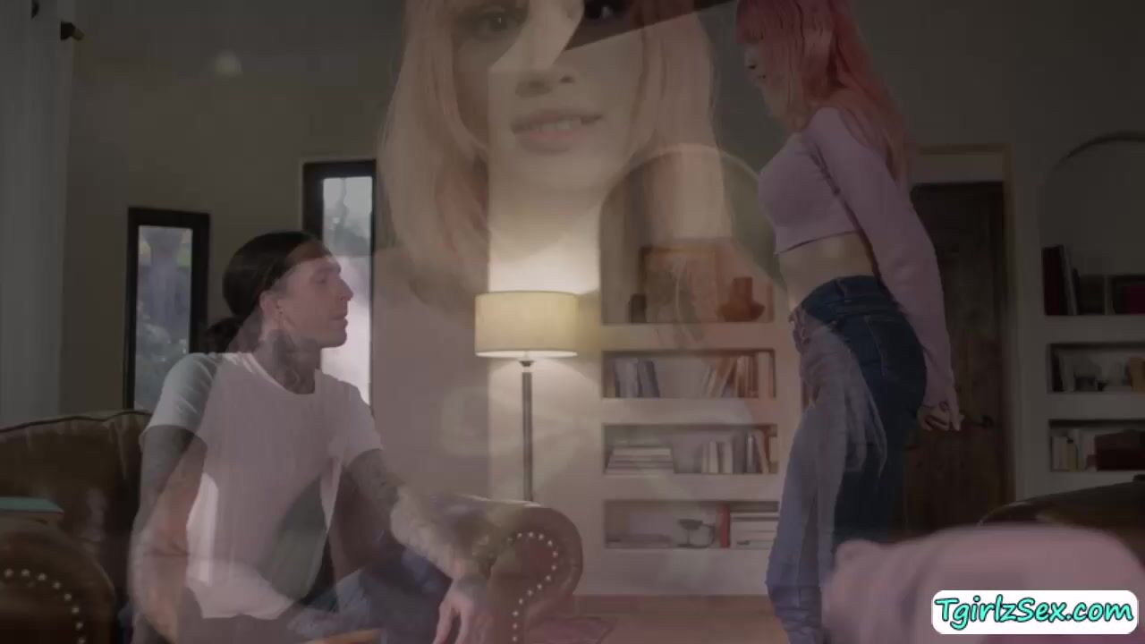In the living room, busty shemale Mimi Oh flirts and playfully strokes tattoed Ruckus big cock before she whips it out for a mouthful deepthroat blowjob. The big tits tbabe moans in orgasm as she rides his huge dick in hardcore anal bareback after rimjob.