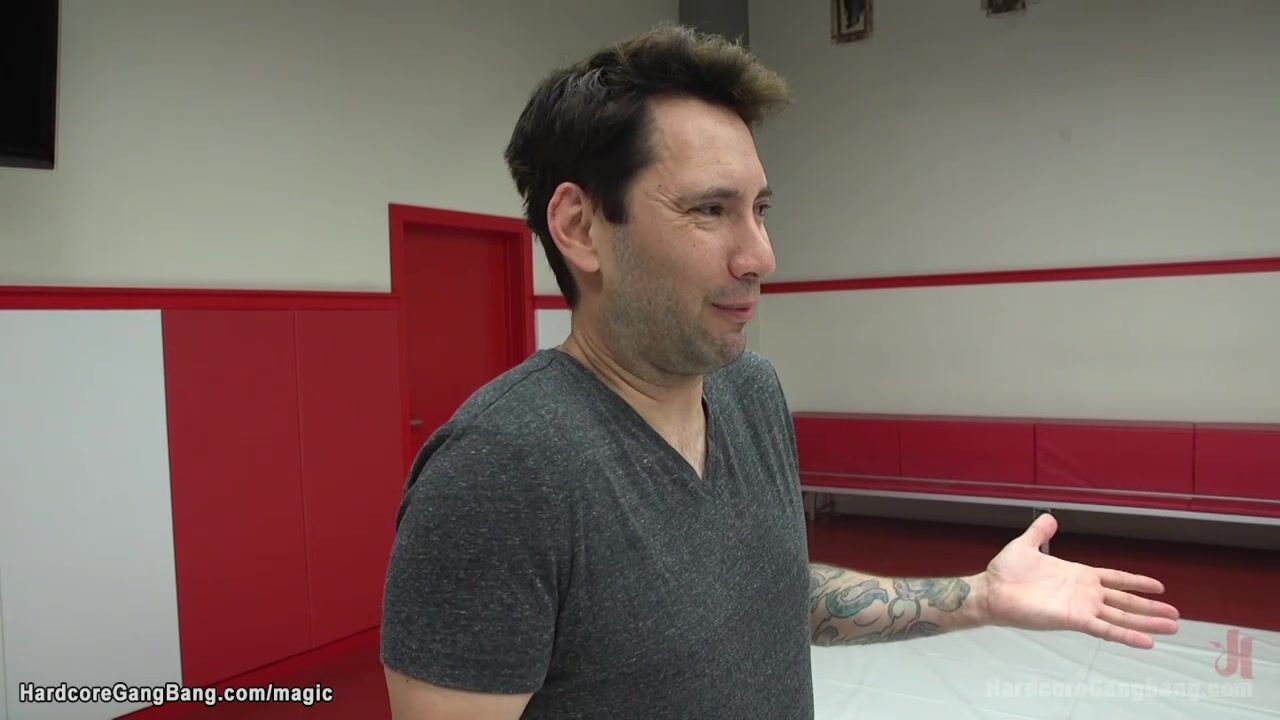 Five wrestlers take big natural boobs brunette babe Arabelle Raphael and with big dicks gang bang and double penetrate big ass tattooed hottie in the gym