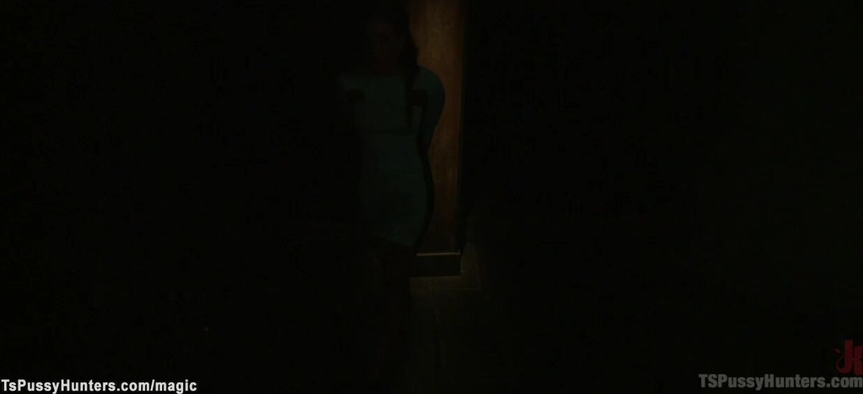 Sexy brunette shemale dom Kelly Klaymour binds and gags and blindfolds sexy brunette babe Savannah Fox for her Bday and anal fucks with big cock