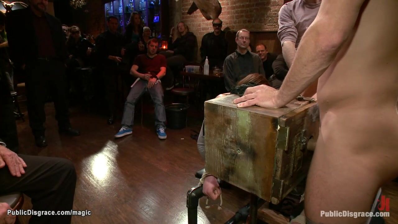 Brunette slave Cheyenne Jewel is bound down on knees and mouth fucked then gang bang and double penetration fucked in public crowded bar