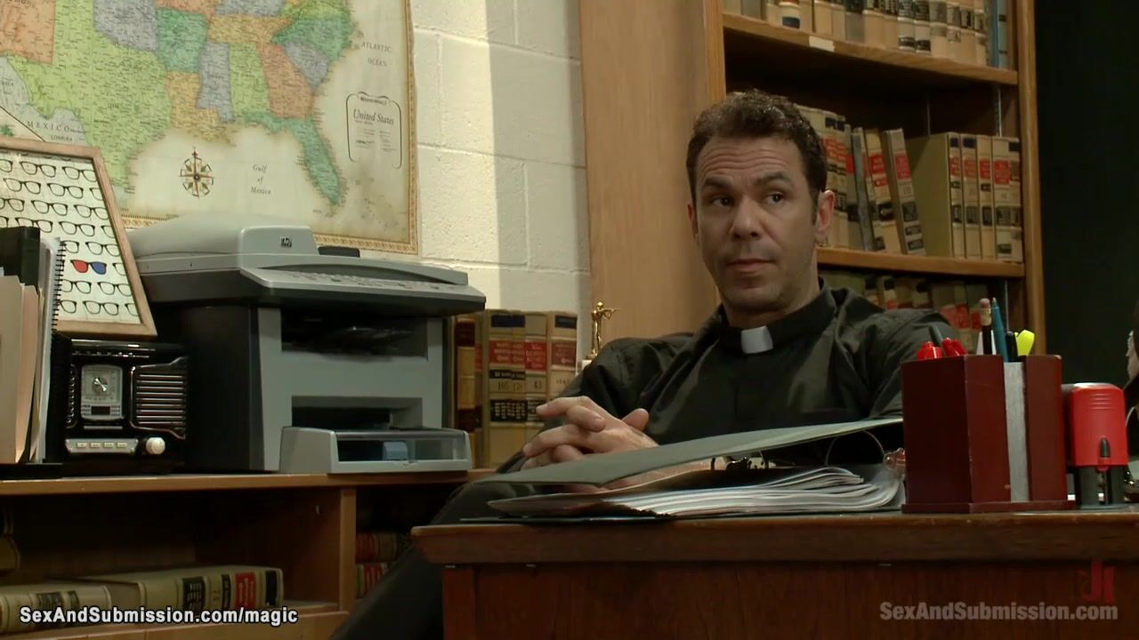 Small tits blonde bully Amanda Tate is bound to wooden cross by priest Steven St Croix then ass and pussy fucked by his big cock in classroom