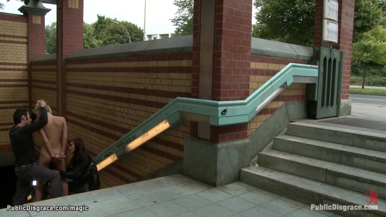 Naked European blonde slave Diana Pink with nipples clamped and chained to weight gets pussy vibrated then bound fucked by big cock Tommy Pistol and Princess Donna Dolore in public