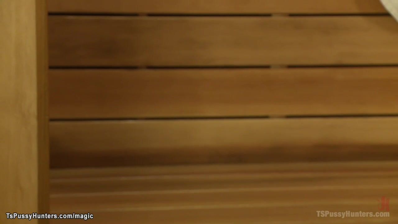Horny Asian shemale Venus Lux follows sexy brunette babe Roxy Raye from sauna to toilet and there with huge dick fucks her in pussy and ass
