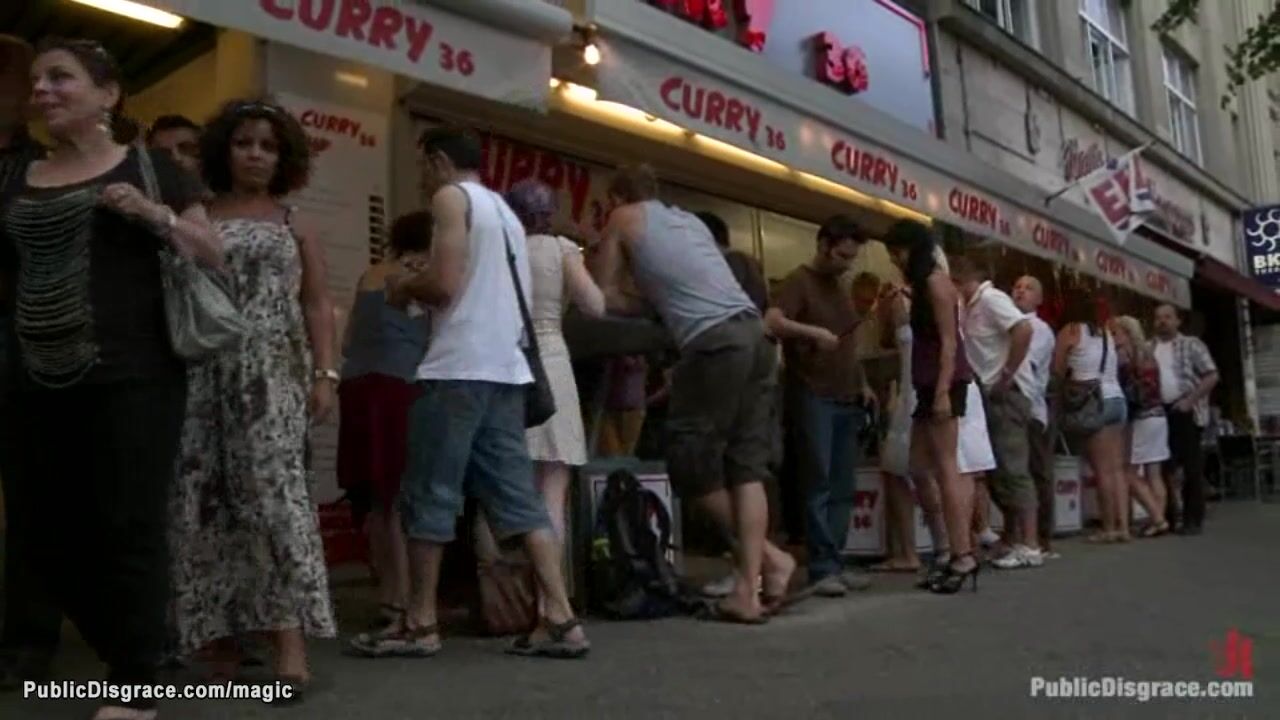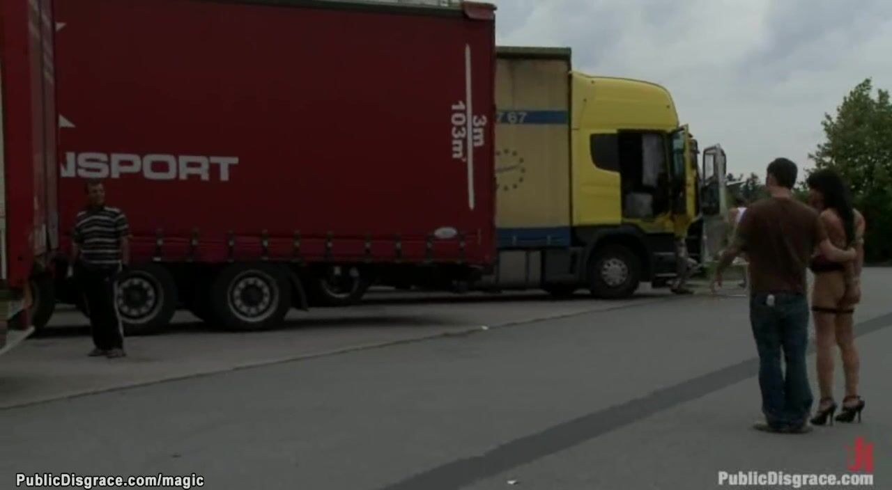 Bound and gagged brunette Euro slave Felicia D walked in truck parking by big cock Tommy Pistol and fucked then humiliated in public