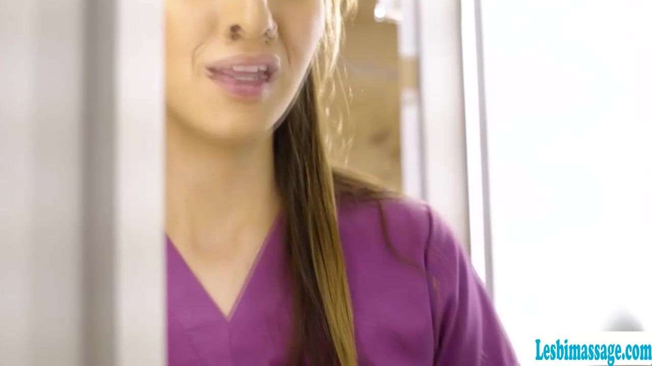 Busty brunette masseuse watches her co worker and her client kissing in the massage room.After that,she goes in and joins them.They start kissing in threesome way and next is,they get naked and lick their wet pussies passionately.