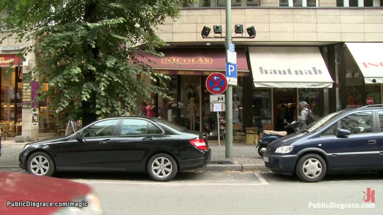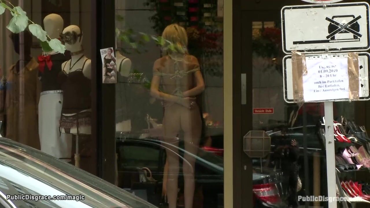 Slim small tits blonde Euro babe Blanche is bound and exposed in public window then in the park fingered and mouth fucked by big dick Zenza Raggi