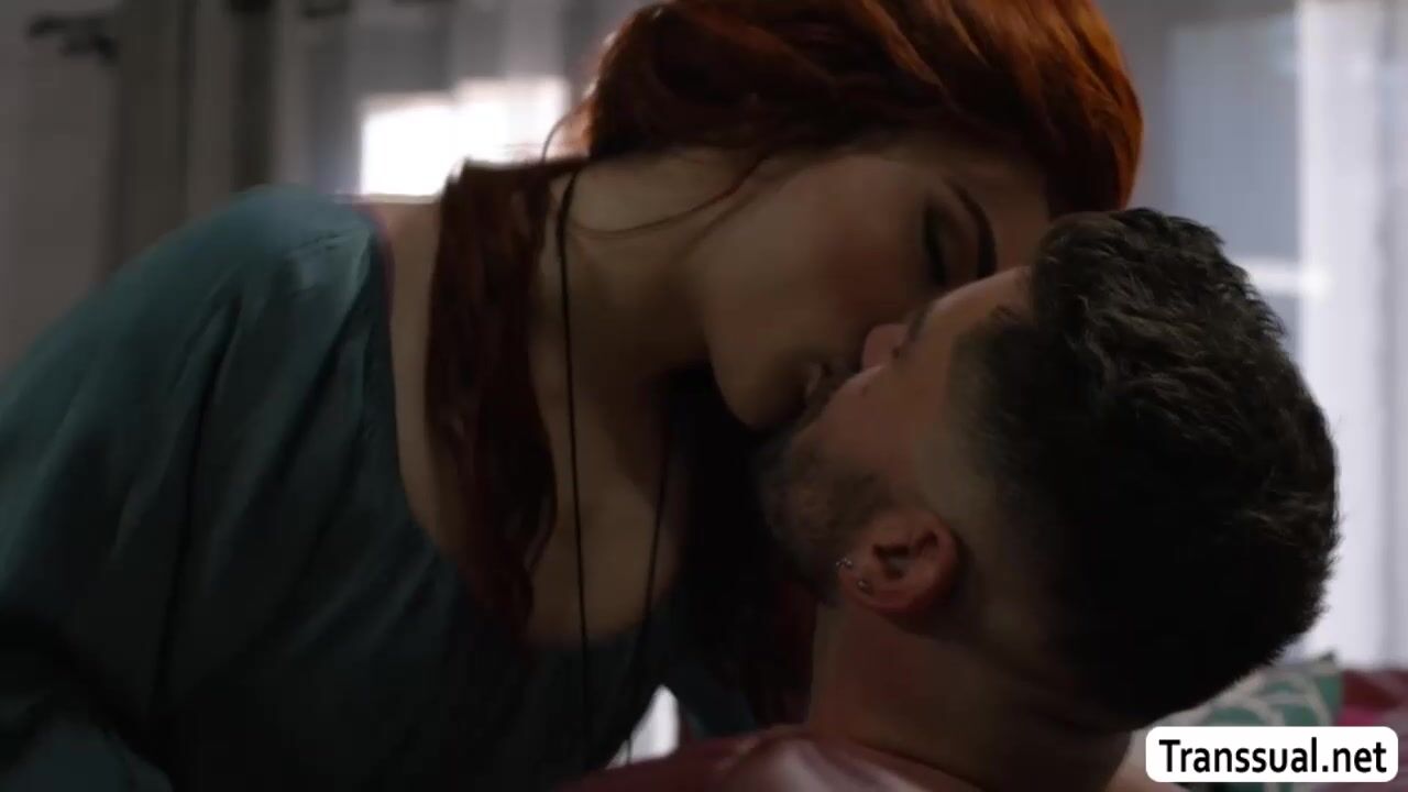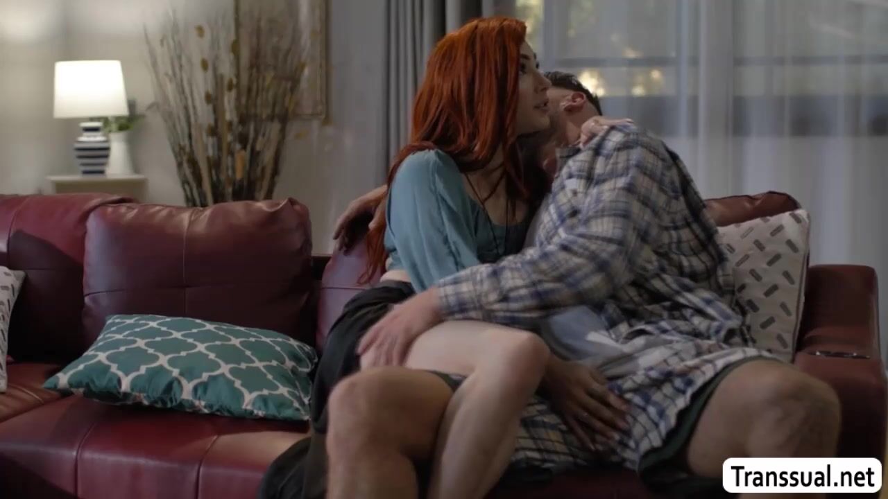 Horny redhead ladyboy and her new boyfriend are kissing each other on the couch.After that,she throats his hard big cock passionately and in return,the guy bareback fucks her tight wet ass so deep and fucking hard.