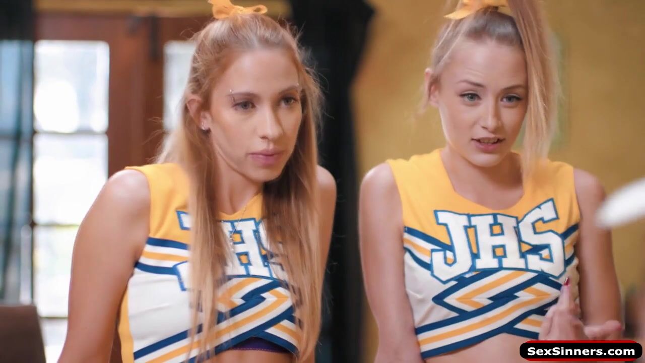 Petite cheerleaders want to settle who will be head leader now.The coach inspects their asses and gives both horny teens a rimjob.The small tits babes deepthroat his big cock.They lie on top of each other and kiss while both are anal fucked
