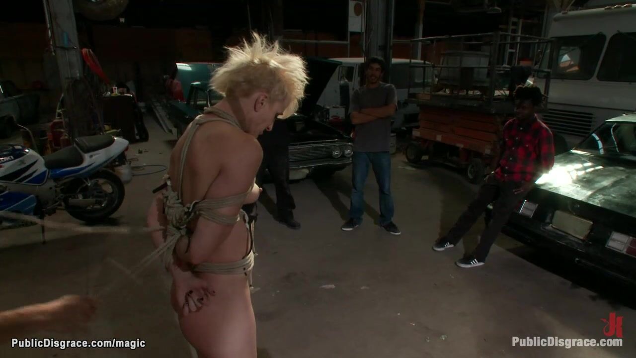Blonde slut Dylan Ryan with bound hands in box tie behind back dragged in public auto repair shop where vibed and spanked and deep throat fucked by big dick master Tommy Pistol