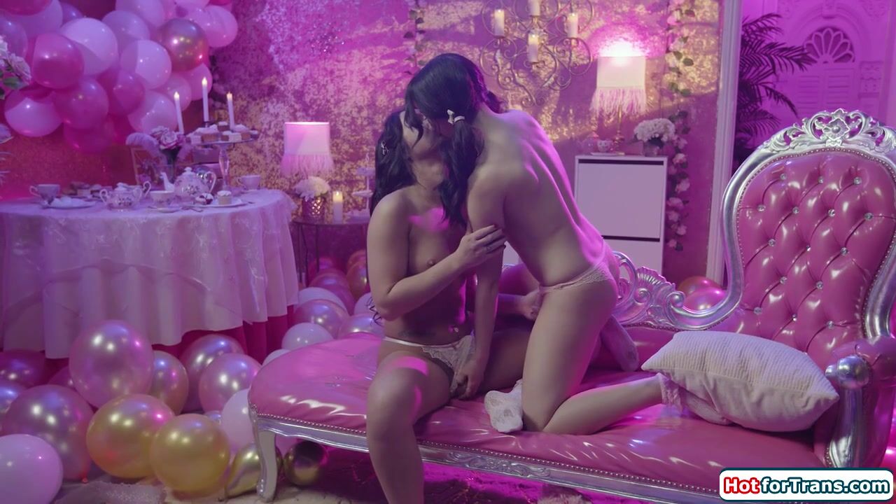 Busty trans Khloe Kay kissing her muse Jane Wilde.The petite small tits babe sucks the big tits shemales boobs and hard tranny cock.The tgirl licks the hotties hairy pussy making it wet to fit her dick in.The brunette ts fucks her tight snatch