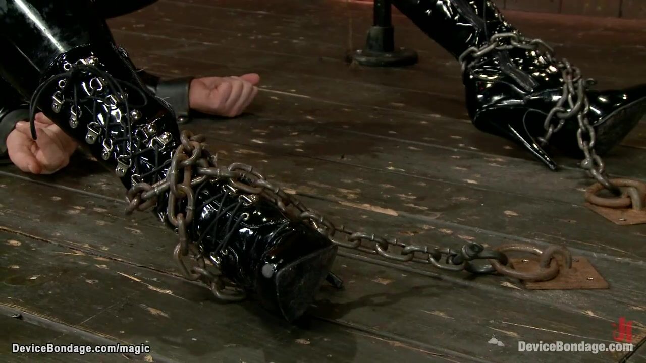Huge boobs blonde MILF lesbian slave Dee Williams in black latex suit and boots is chained on the floor then suspended and finger fucked by lezdom Claire Adams