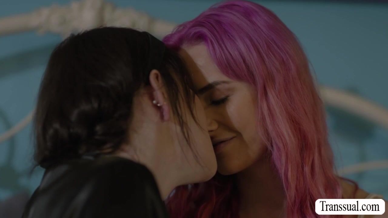Shemale brunette and her pink haired friend are on the bed kissing each other passionately.After that,she lets her friend throat her hard shecock and in return,she fucks her friends tight wet pussy so deep and fucking hard.