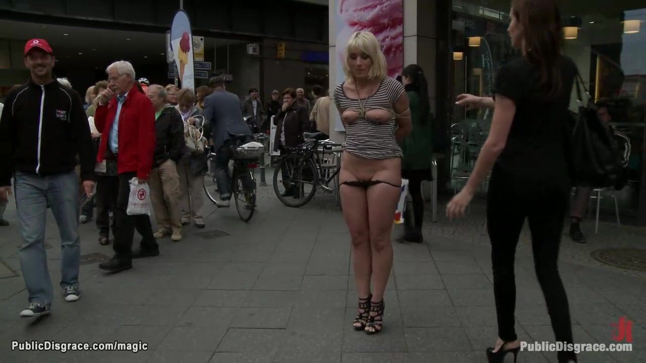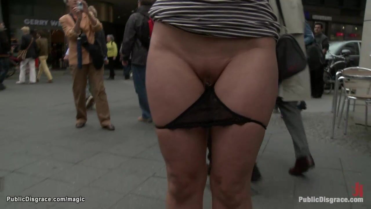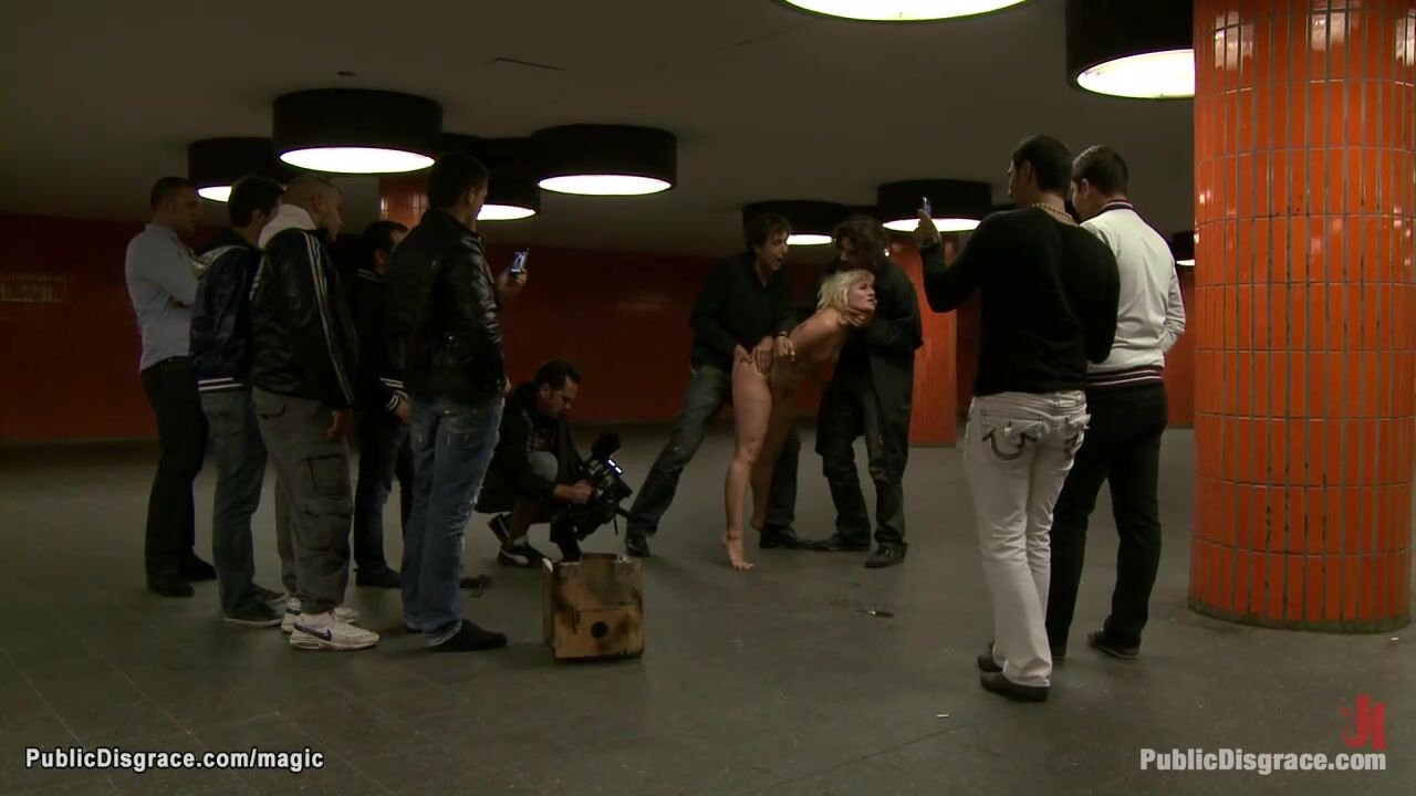 Blonde European slave Uma Masome with panties down exposed in public streets then in subway deep throat and anal fucked by big cock Steve Holmes