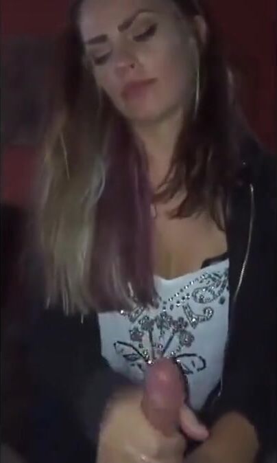 Blonde babe gives a handjob to her horny lover with her clothes on.