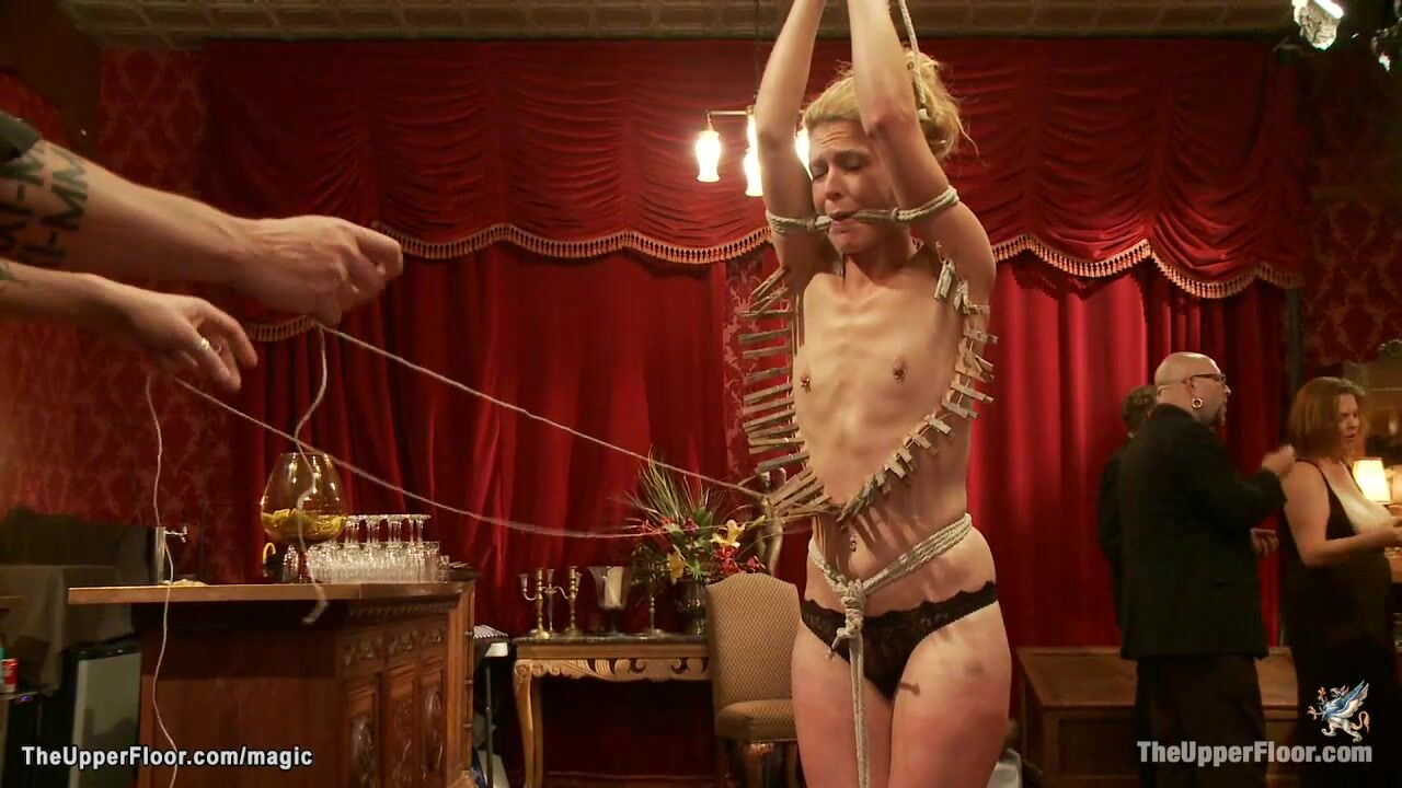 Hot big tits MILF slaves Penny Barber and Simone Sonay are spanked and anal fucked while other slut zippered and cattle prodded at bdsm orgy party in the Upper Floor