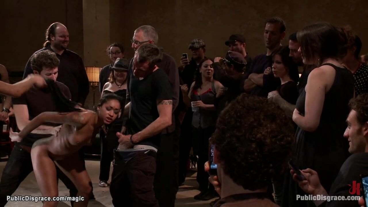 Little ebony slave Skin Diamond zippered in public on the ground then groped and gang bang fucked with big cock and strap on in ffm
